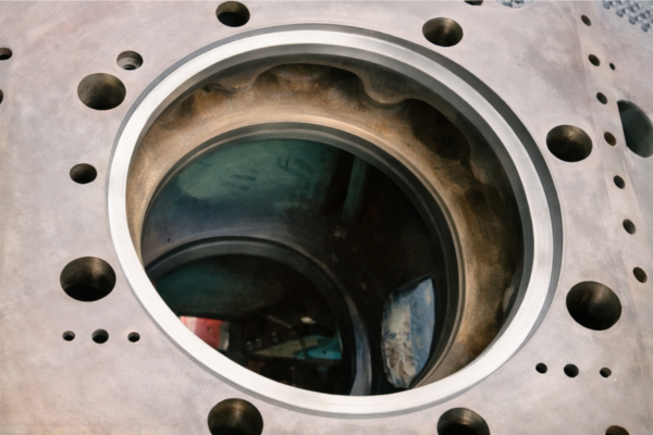 Pode ser utilizada em motores diesel PC2 Pielstick. Na foto vemos a operação de boring na parte inferior e faceamento da parte superior (entablature).